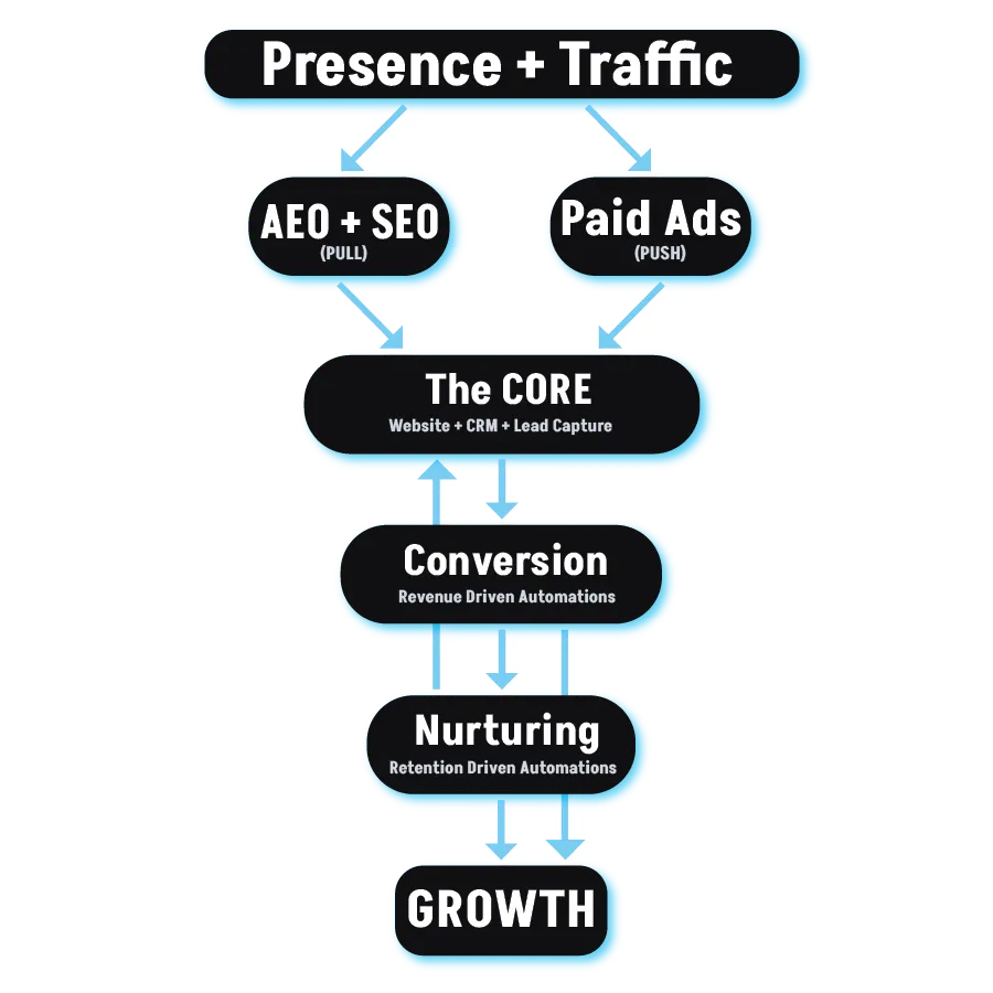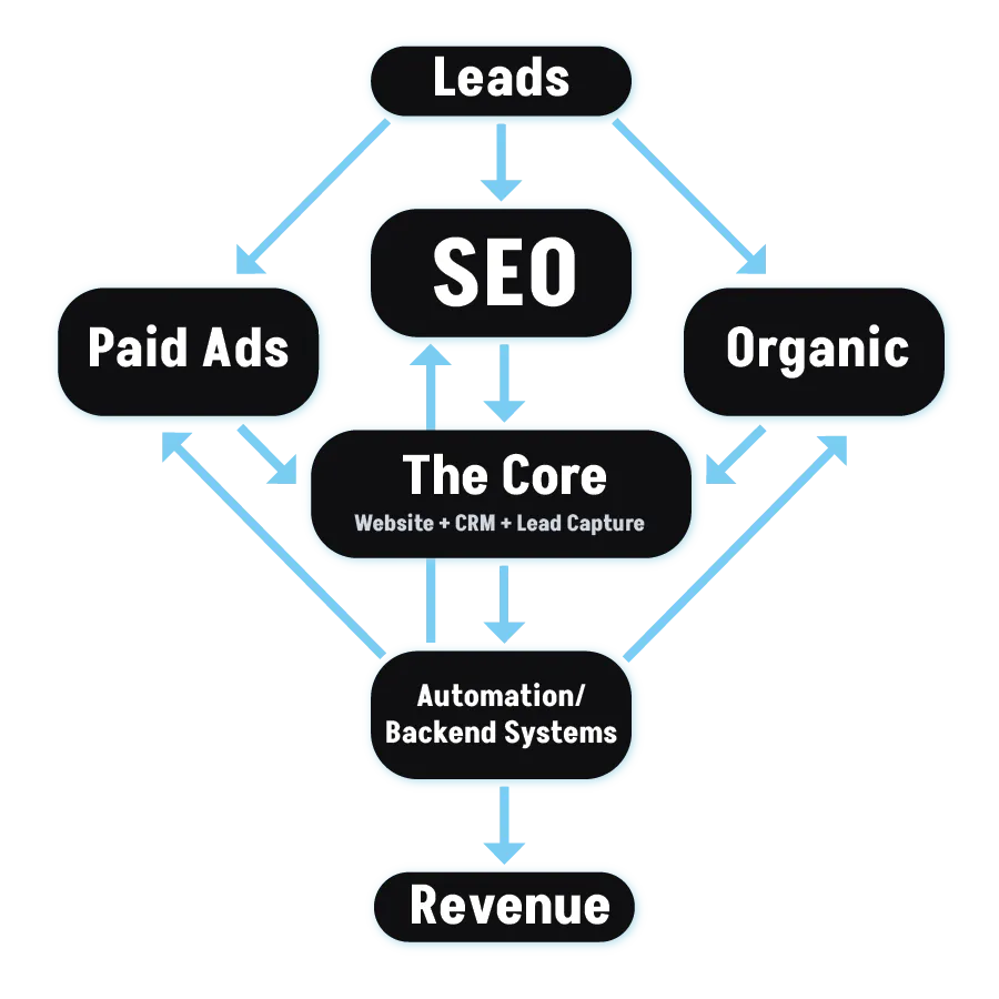 Your website, CRM, marketing, and automations are designed to work as one machine, not disconnected tools and vendors.